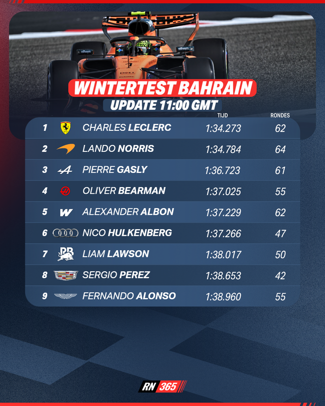 Alpine's Pierre Gasly was third but 2.5s adrift of Leclerc, although the Frenchman did manage 61 laps. With 64 laps to his name, Norris was the busiest driver on Thursday morning.