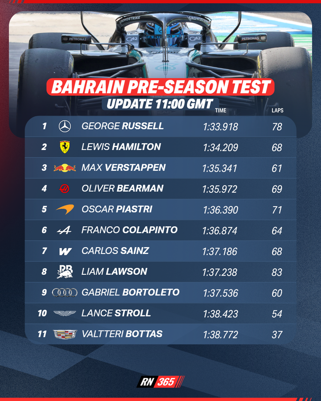 Haas' Oliver Bearman and Oscar Piastri completed the top five, with all 11 teams having completed some running.