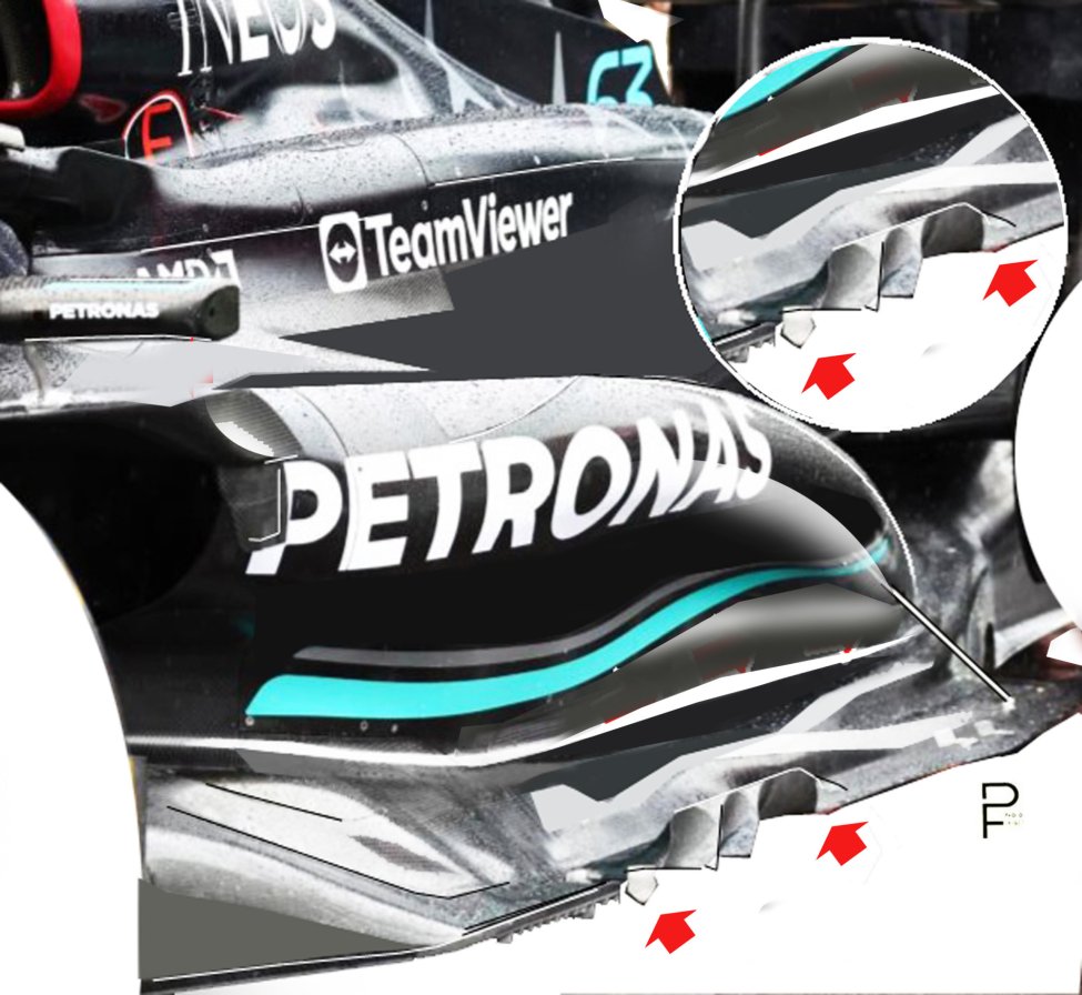The Brackley-based team introduced a modification to the lateral edge of the W14's floor and also to its upper conformation - characterised by large humps that hide a non-linear conformation of the lower Venturi channels - as well as a revision of the external barge boards, which increasingly adopt a profile similar to that of the same elements of the Red Bull RB19.