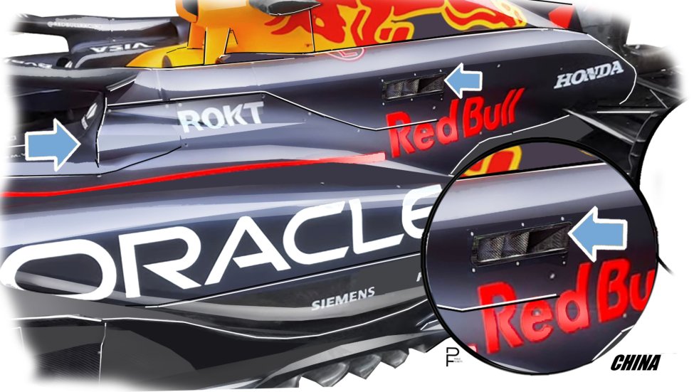 In Shanghai, despite the decidedly low temperatures, the rectangular slits that were present in Bahrain and Melbourne were re-introduced on the RB20s to increase heat exchange.