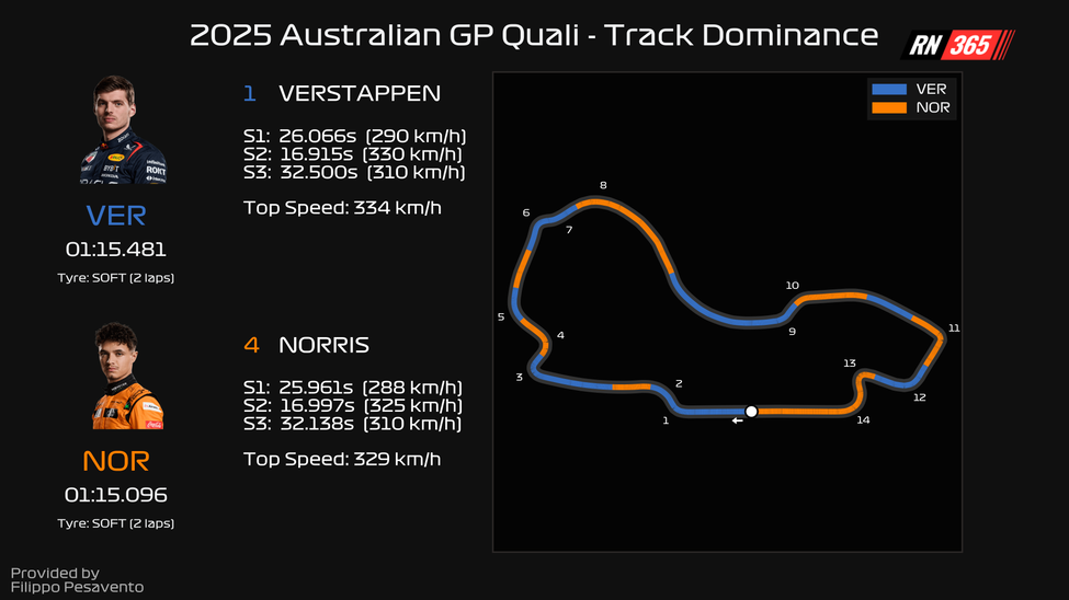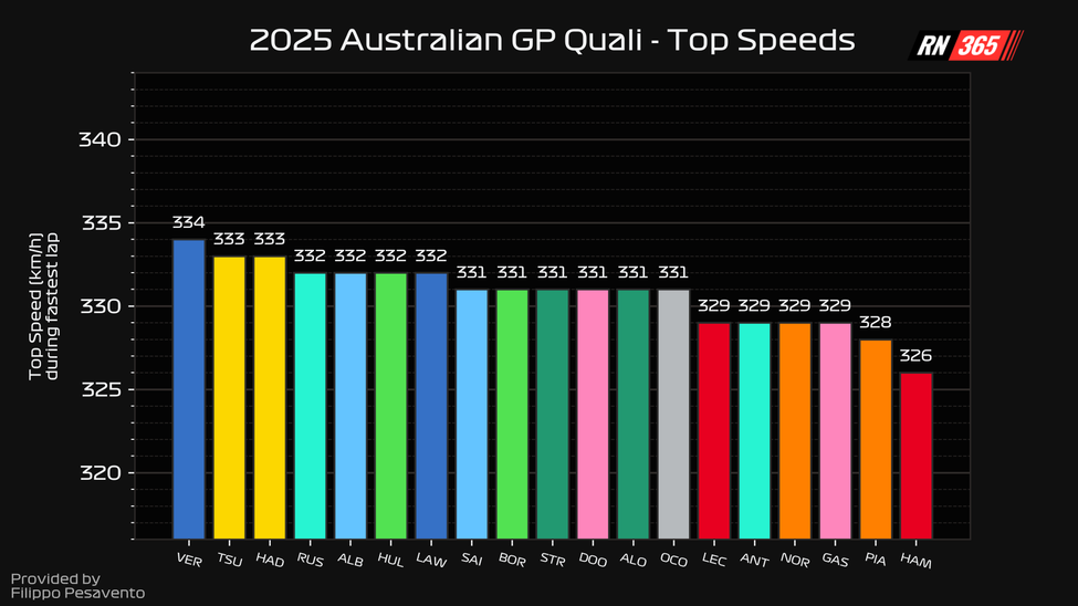 In terms of setup, interesting choices can also be observed. Verstappen had the highest top speed of anyone in qualifying, indicating that Red Bull is running less downforce than McLaren.