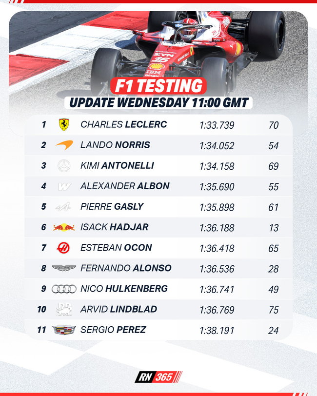 In terms of overall running, Racing Bulls' Arvid Lindblad completed the most laps with 75, followed by Leclerc [70] and Antonelli [69].