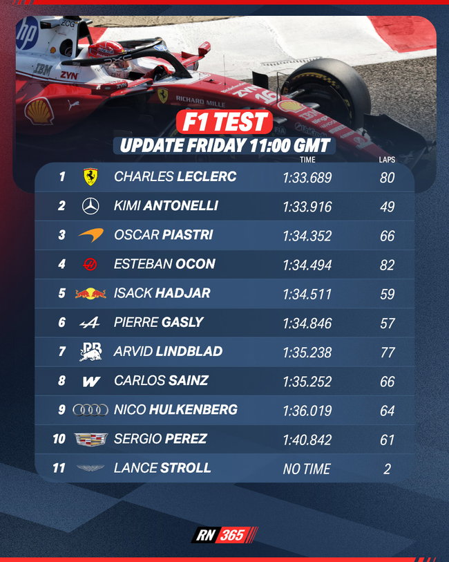 Antonelli was limited to just 49 tours in his final morning after a loss of pneumatic pressure caused a red flag, with Mercedes being forced to change the power unit before George Russell assumes control of the W17 to round out the test.