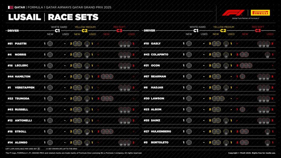 As it stands, nine drivers have a new set of softs available. Those that do not are the top 10 on the grid, due to using an extra set of softs in Q3, and Racing Bulls' Liam Lawson.
