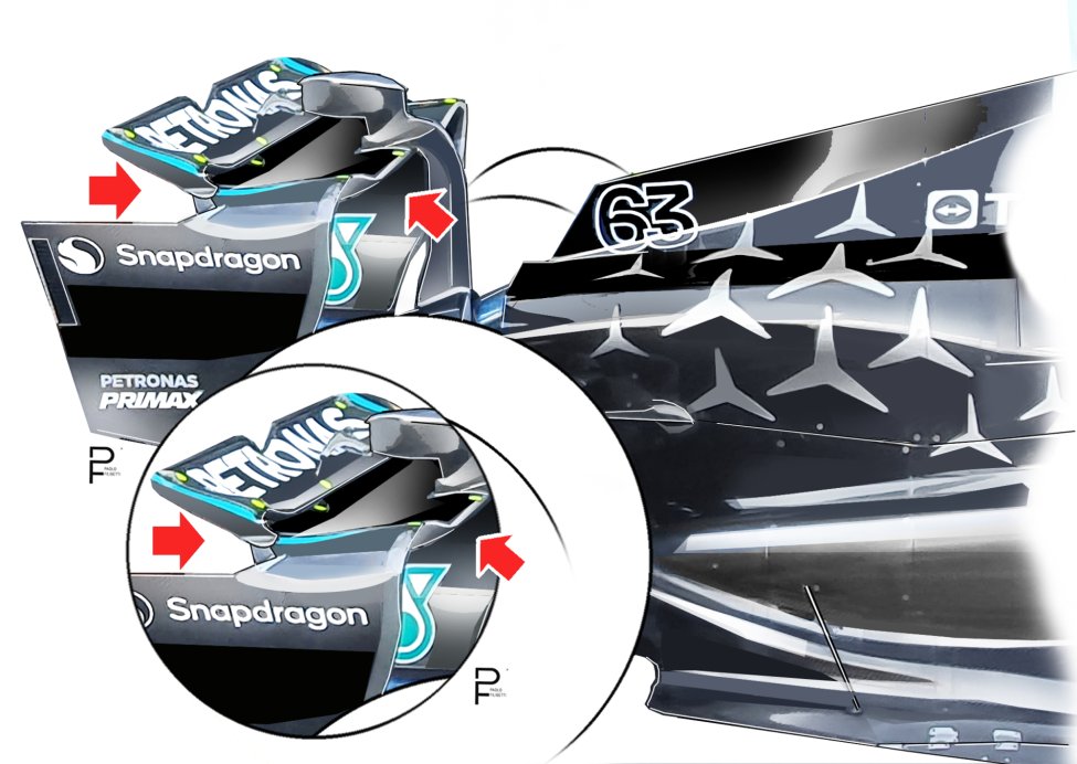The car that adopted the most extreme rear wing was the Mercedes W15, with the version introduced in Saudi Arabia characterized by the upper profile being decidedly placed very high, implying a very reduced incidence of the flap.