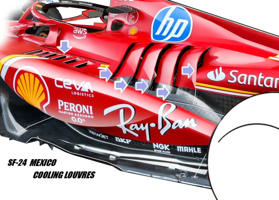 Ferrari's new bodywork is characterised by large louvres that extend to the upper part of the sidepods, with further louvres on the side of the cockpit to aid in the extraction of the hot air from the sidepods.
