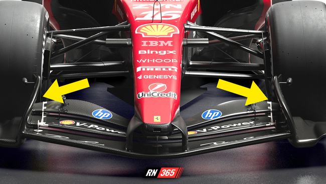 The front wing assembly demonstrates Ferrari's approach to the mandated active aerodynamics systems.