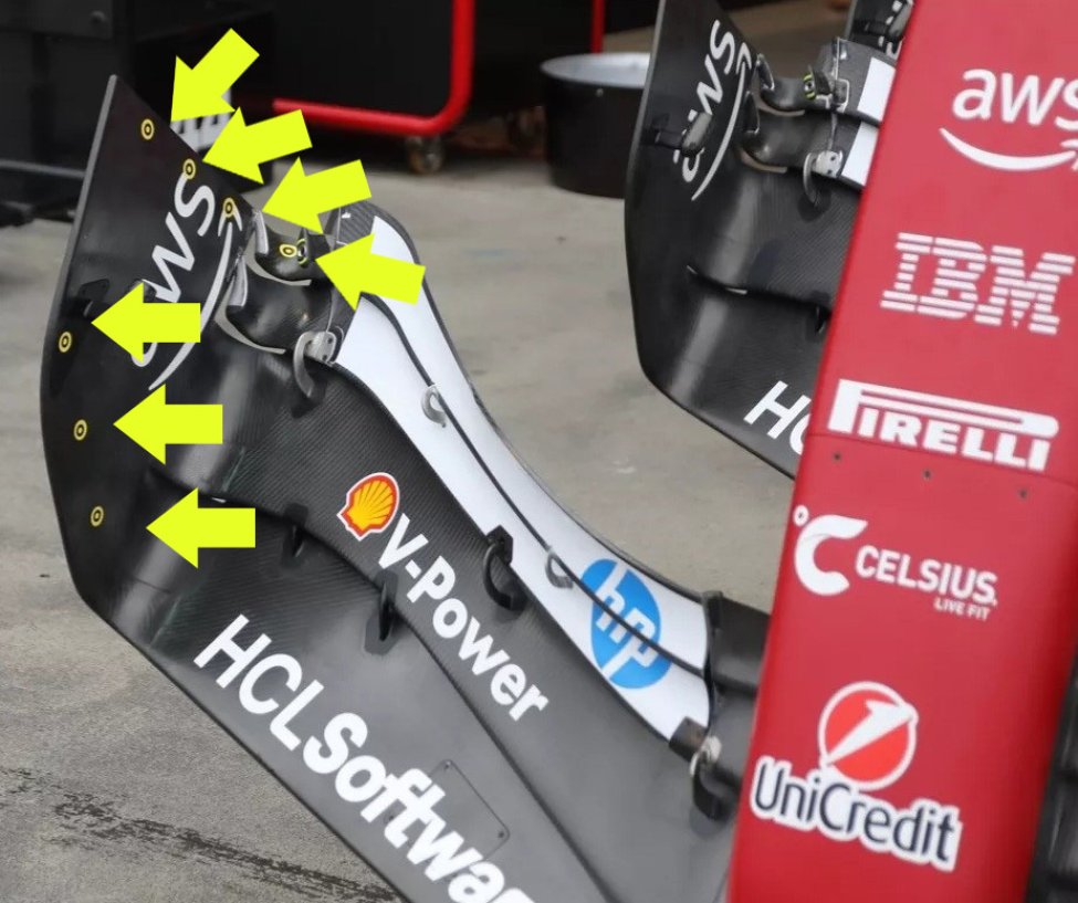 To achieve this, the Maranello engineers have equipped the inner end plates with visual target stickers to monitor the flexing of individual elements with respect to the end-plate itself and its lateral flexing.