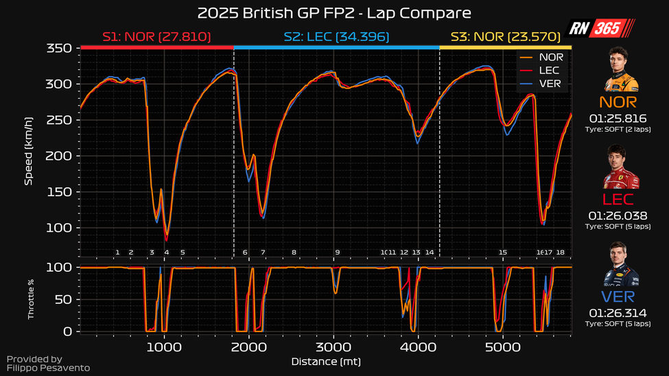 Below, you can see how Norris' throttle map and speed compare to Leclerc and Verstappen during their fastest laps.