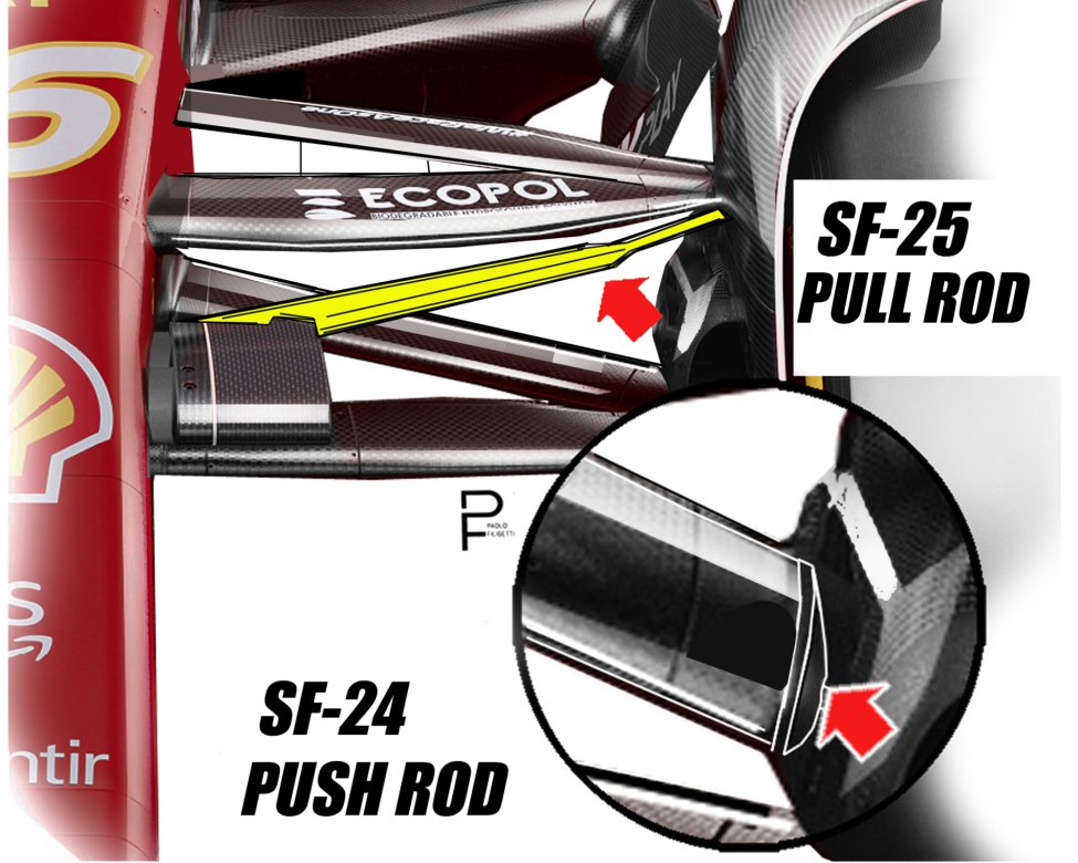 Every previous ground effect Ferrari has used push-rod front-suspension, but the SF-25 is to use pull-rod, it is a radical change.