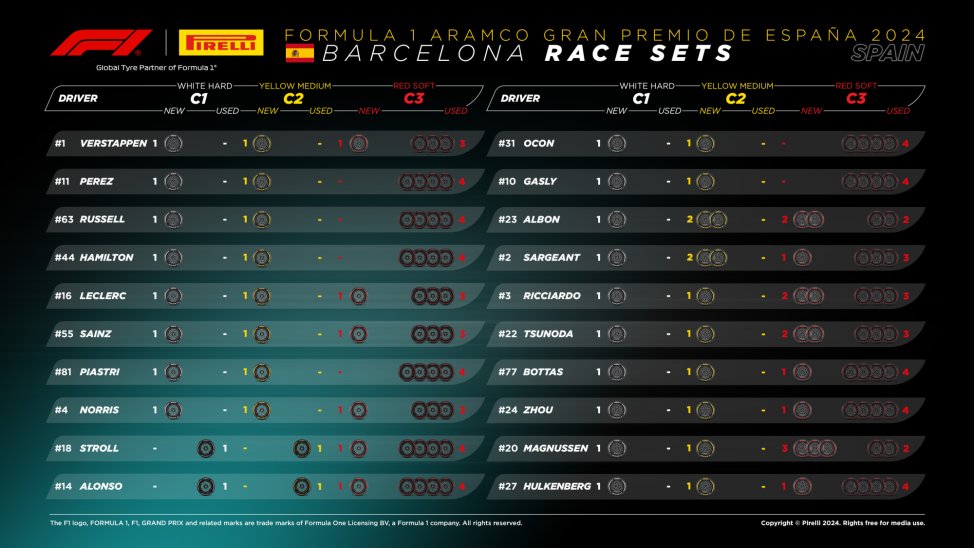 The entire field has a brand-new set of the medium and hard tyres available, with Aston Martin pair Fernando Alonso and Lance Stroll appearing to be the exception.