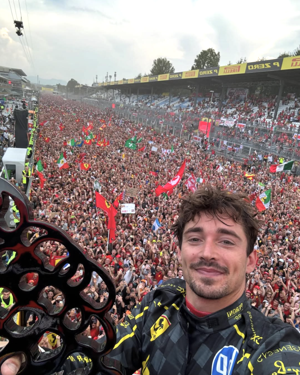 It was a stunning selfie image of Leclerc on the podium at Monza following his Italian Grand Prix triumph, clutching the winner's trophy in one hand, and with a sea of fans stretching far away behind him down the main straight at the famed circuit.