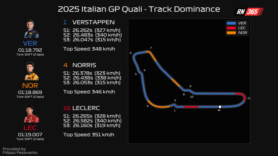 Verstappen lost only 0.045s, mainly because he dared to attack Lesmo 1 harder and his top speed was simply higher.