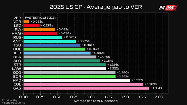 On average, Norris lost just 0.083 seconds per lap to Verstappen, while Piastri was 0.494 seconds off the Dutchman’s pace.