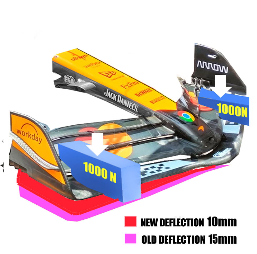 In extension of this, it is important to remember that the maximum loads that can be placed upon the front wing at maximum speed can reach a level three times higher than the static loads of the flexibility tests.
