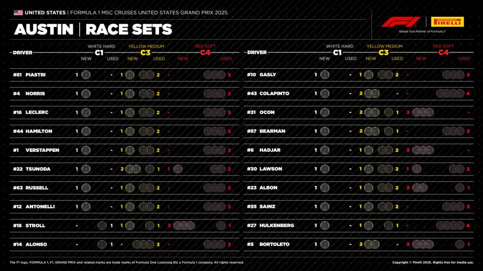 Heading into the 56-lap race, all of the leading contenders have one new set of the C1 hard tyres, and one new set of the C3 medium compound, along with two used C3s.