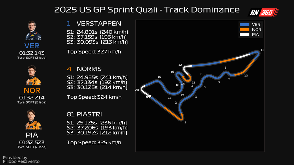 While McLaren's package also demonstrates high aerodynamic efficiency at COTA — as evidenced by the marginal lap time delta — Verstappen appears to have a car that matches or exceeds it in key performance areas.