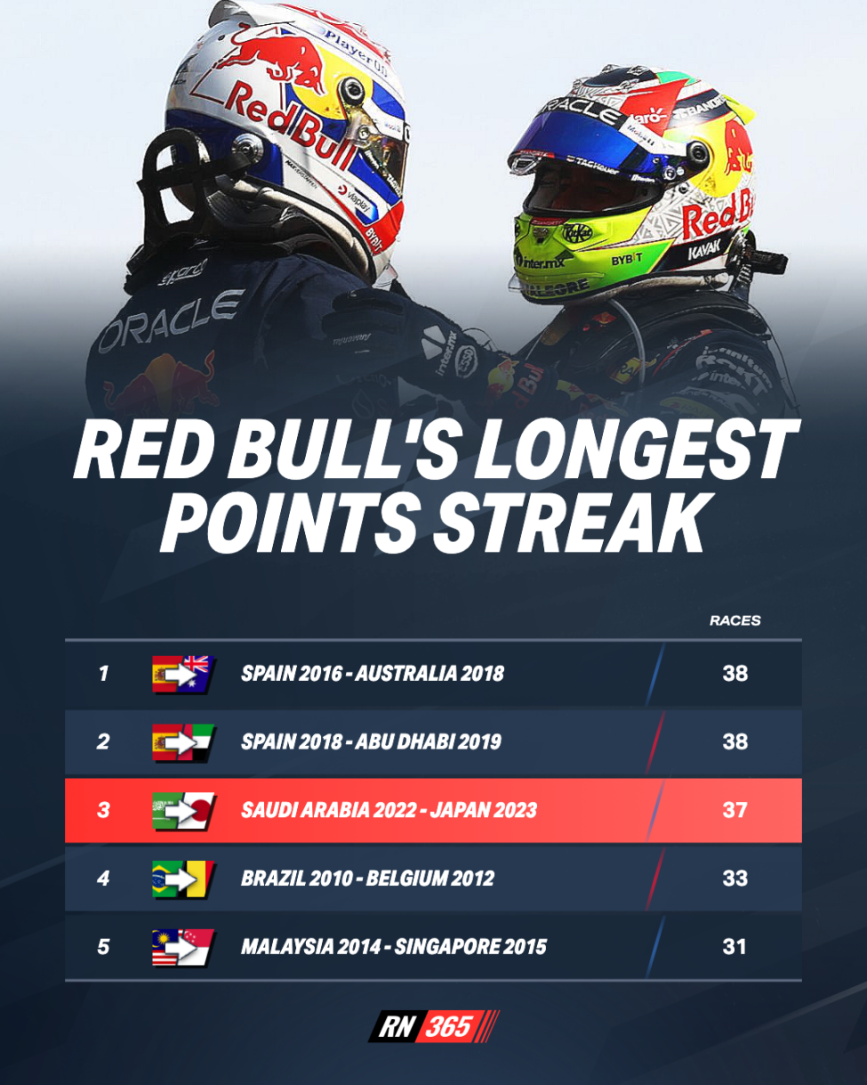 Red Bull's streak stands at 37 ahead of the Qatar weekend having scored in every race since last season's Saudi Arabian Grand Prix.