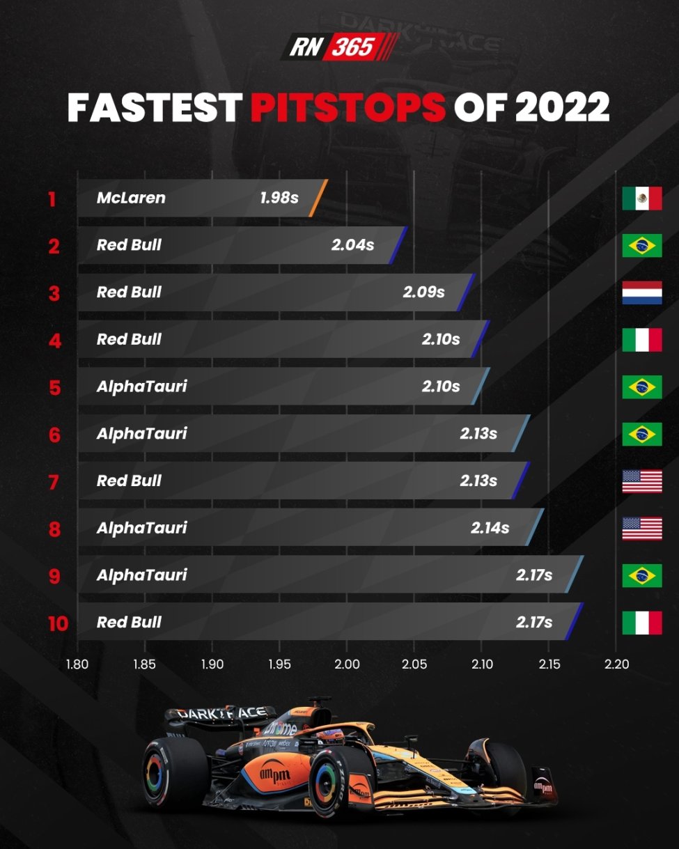 Consistency was the key for Red Bull: the team managed to produce the fastest pit top in nearly every race, taking five of the top 10 spots on the 'Fastest pit stops of 2022' list.