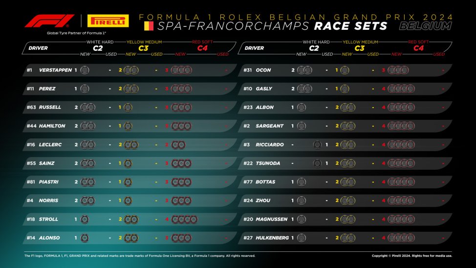 All three of the medium-starting options make use of the hard compound, which may turn out to be the preferred race tyre, with the new track surface at Spa-Francorchamps causing higher-than-expected tyre degradation so far this weekend.