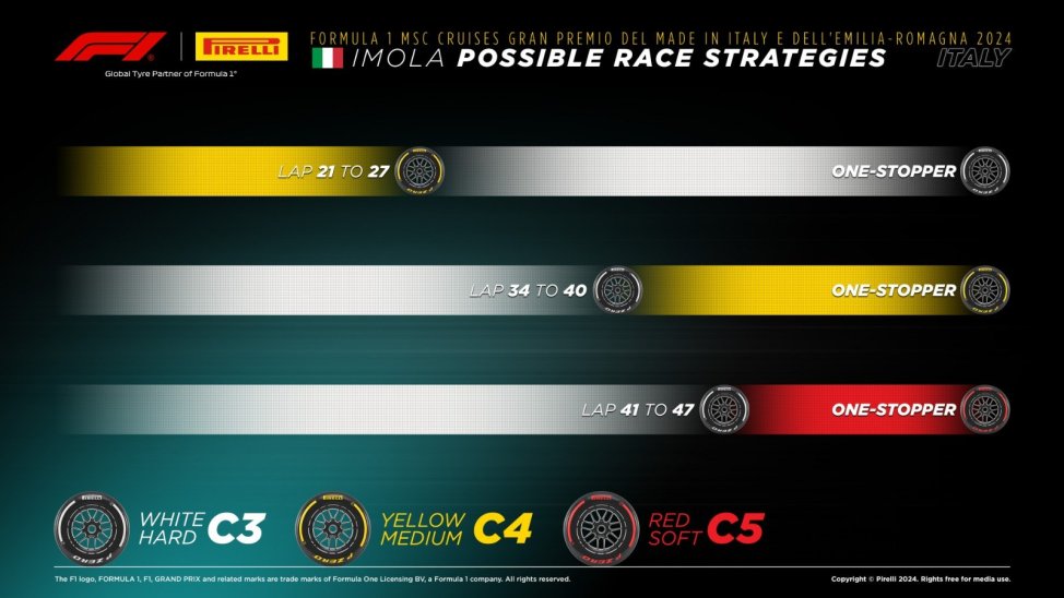 The pit stop window for those starting on the yellow-walled medium Pirellis is expected to be between lap 21 and 27, but teams have ran long at Imola in the past, which could open up the possibility of cars starting on the white-walled hard tyres.