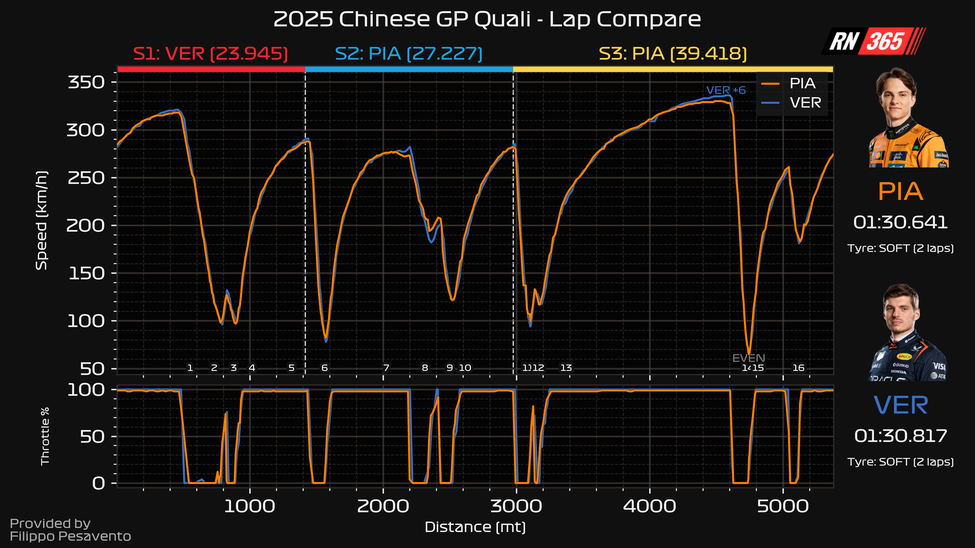 Only through Turn 6 of the heavy traction zones was Verstappen faster than Piastri, with the McLaren accelerating far better than the Red Bull.