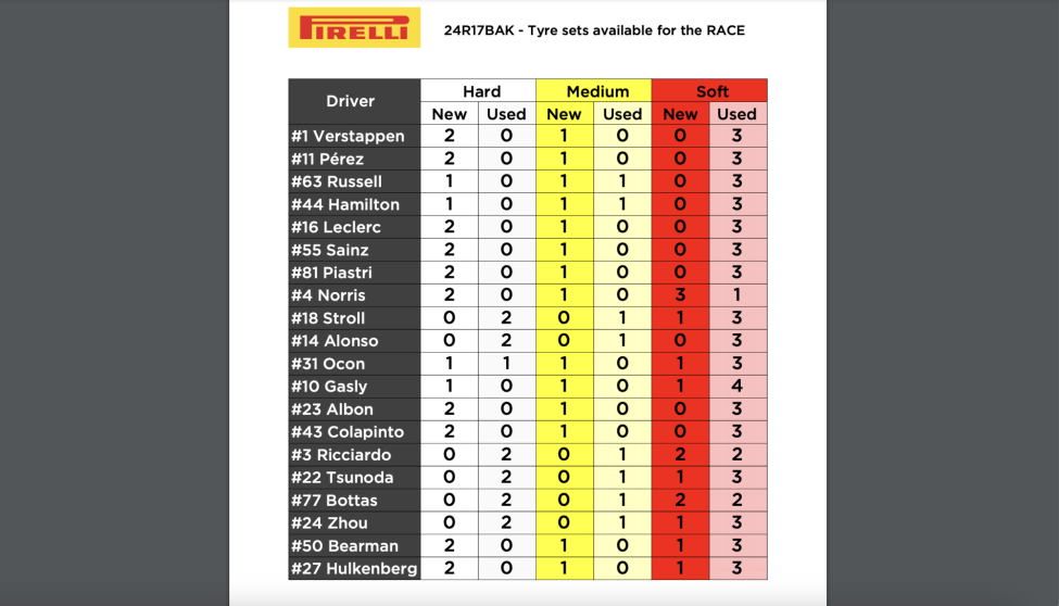 Pirelli director of motorsport Mario Isola said: "In terms of strategy, on paper, the one-stop is definitely the quickest option at this track, with medium and hard the most suitable for the 51-lap race.