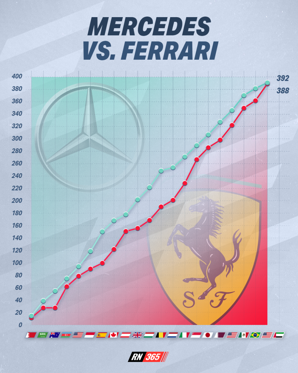 As it stands, Mercedes has 392 points, Ferrari 388 for a slender lead of just four points.